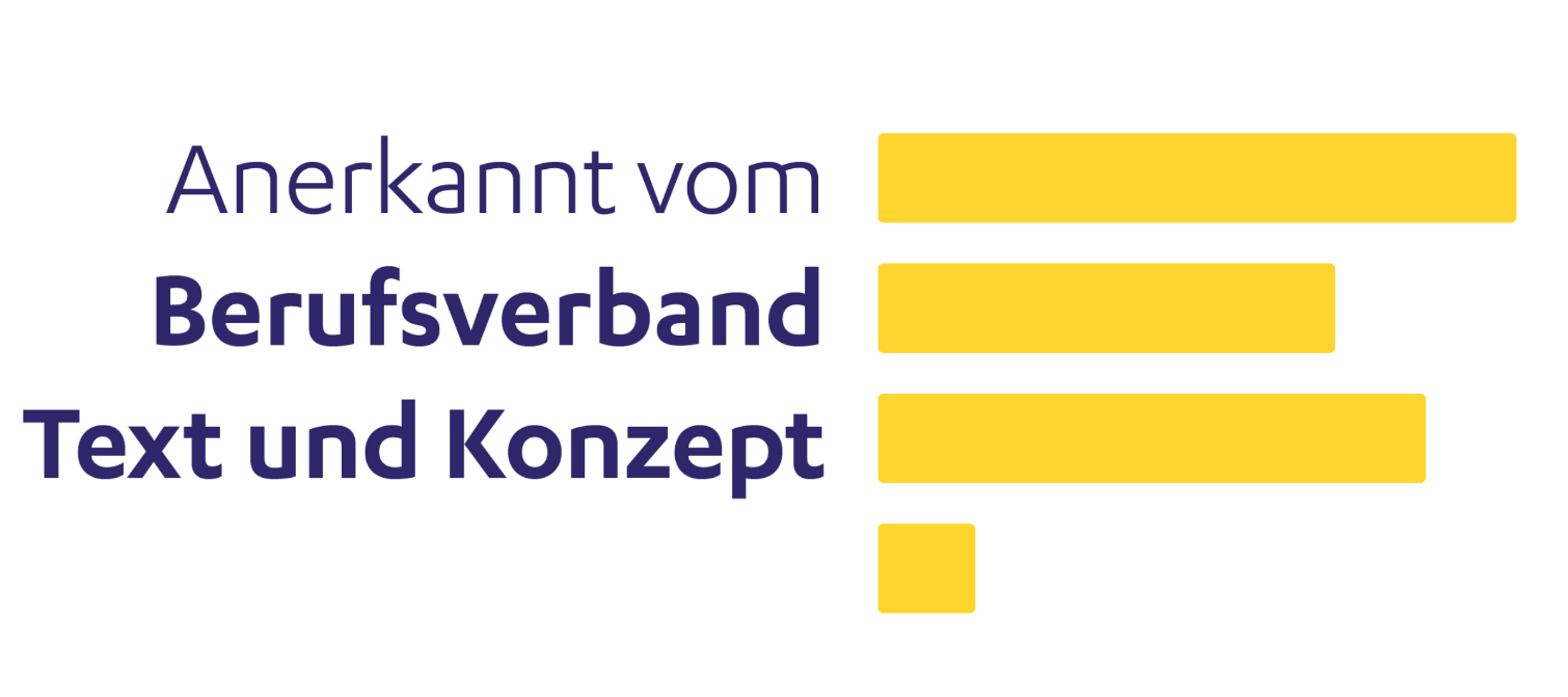 Nach gründlicher Prüfung hat mich der Berufsverband Text und Konzept 2008 als Mitglied aufgenommen. Auf dem Prüfstand standen Kreativität, Konzeption und Stilsicherheit, Referenzen sowie Markterfolg. Ergebnis: Ich bin drin!